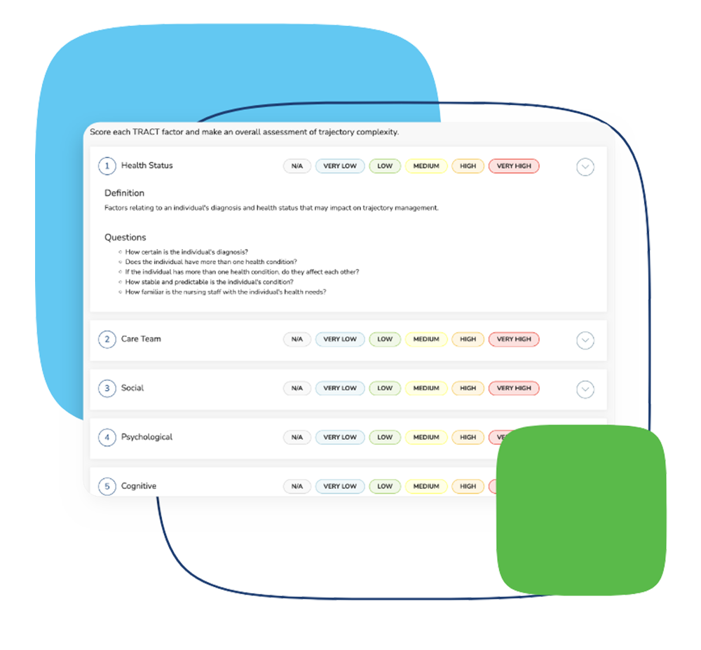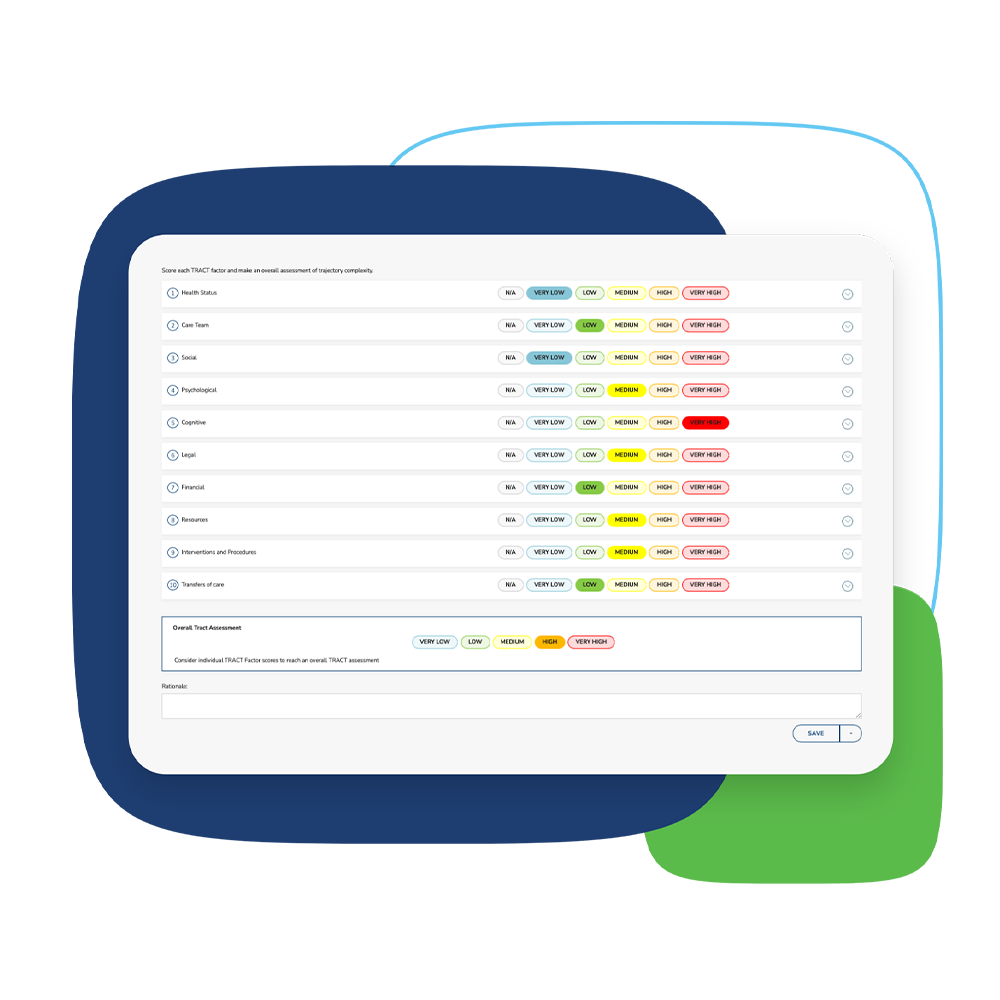 Using the five point scale, assess the patient against the 10 TRACT Factors known to impact on the organisational complexity of patient care. Prompts are provided for each factor to support this process.